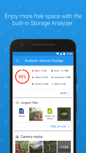 The latest File Commander file explorer takes full advantage of Android P and features the redesigned Storage Analyzer. It shows detailed information on what occupies space on your device and provides suggestions on what you can delete or move to quickly free up internal or external storage.