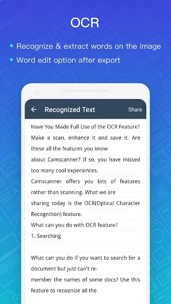 Overview: The world’s No. 1 mobile document scanning and sharing app with over 100 million installs in more than 200 countriesCamScanner helps you scan, store, sync and collaborate on various contents across smartphones, tablets and computers.