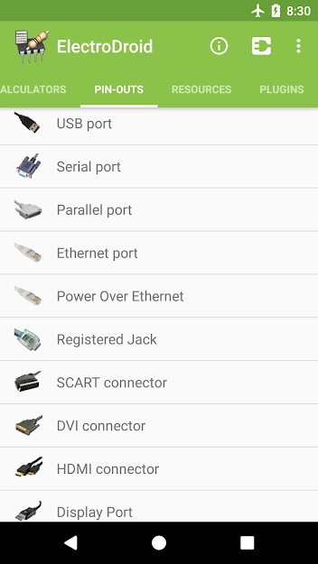 • Port pin-out (USB, Serial, Parallel, Ethernet, RJ, SCART, DVI, HDMI, S-Video, VGA, VESA, Display Port, FireWire, Jack, RCA, Audio DIN connector, XLR/DMX, ATX Power, PC peripheral connectors, EIDE/ATA, SATA, PS/2-AT, MIDI/Game port, Apple 30-pin, Apple Lightning connector, PDMI, OBD-II, 25-pair phone cable color code, Color Code for Fiber Optic Cables, MIDI connector, SD card, Raspberry Pi, LCD, GPIB/IEEE-488, ISO connector for car audio, Trailer connector, Thermocouples colors, Arduino pin-outs, JTAG pinouts, BeagleBone boards);